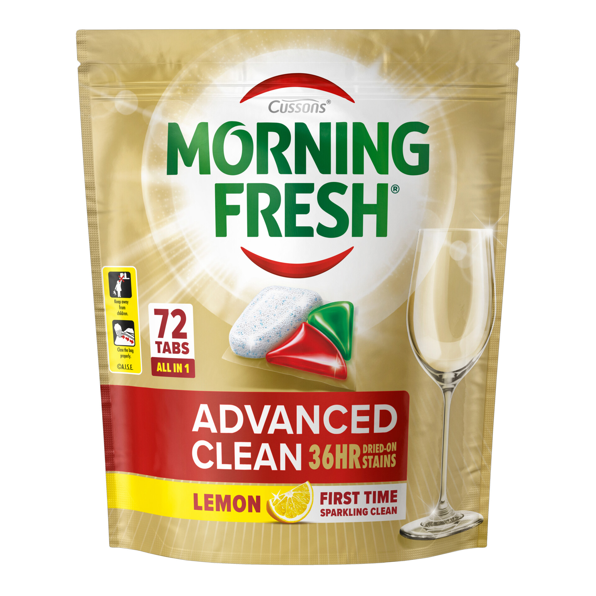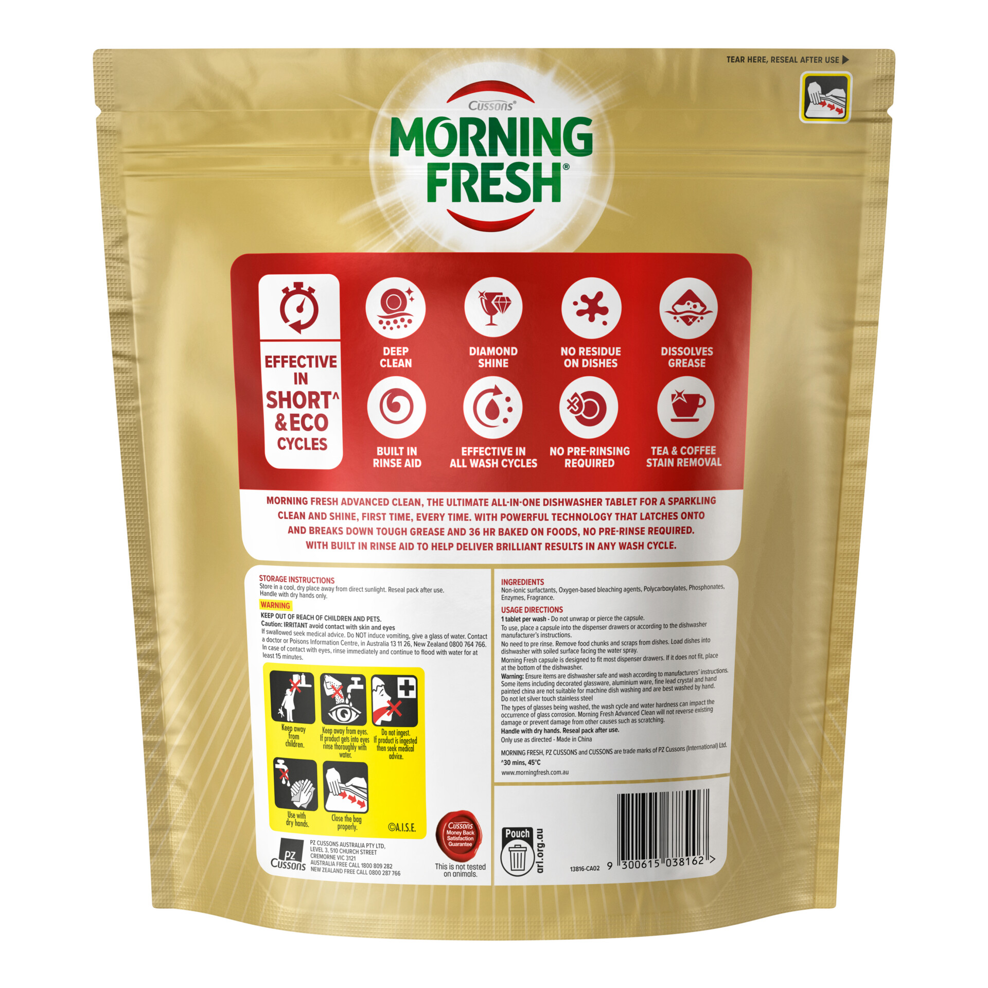 Morning Fresh Advanced Clean Dishwasher Tablets, the ultimate all-in-one dishwashing tablet for a sparkling clean and shine, first time, every time. With powerful technology that latches onto and breaks down tough grease and 36-hour baked-on foods, no pre-rinse required. With built-in rinse aid to help deliver brilliant results in any wash cycle.